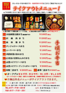 テイクアウト好評受付中です。事前にお電話でご注文頂き、受取り日時をご指定のうえご来店ください。